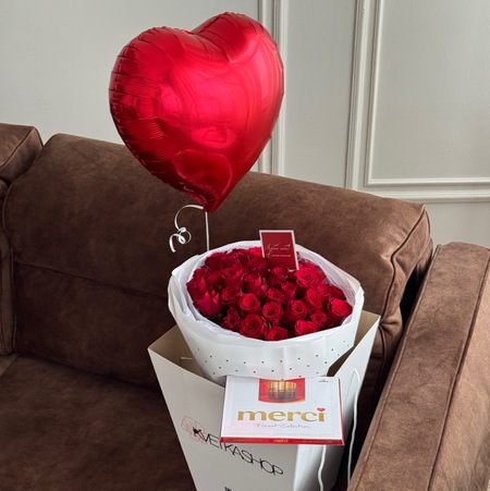 Набор №1 Красные розы(35шт)+мерси+шар+открытка